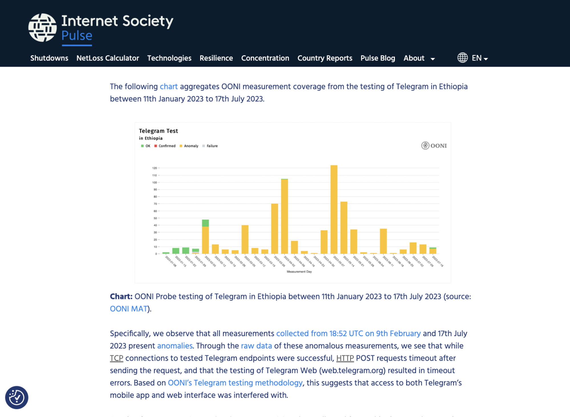 - ISOC Pulse post on social media blocks in Guinea. As part of the ISOC Pulse shutdowns project, ISOC included OONI data and analysis in their post about the social media blocks in Guinea.